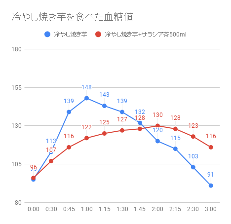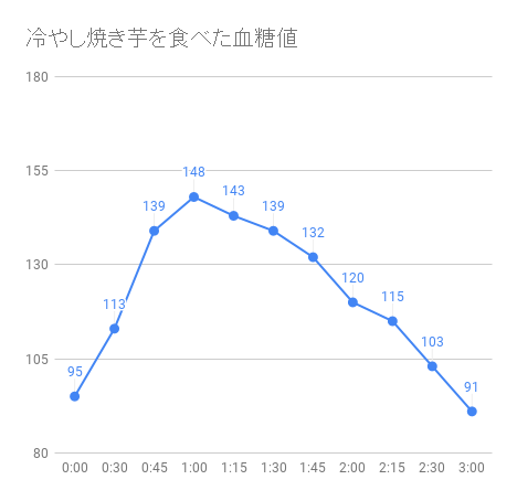 ということで、まずは冷やし焼き芋、単品の血糖値はこちら