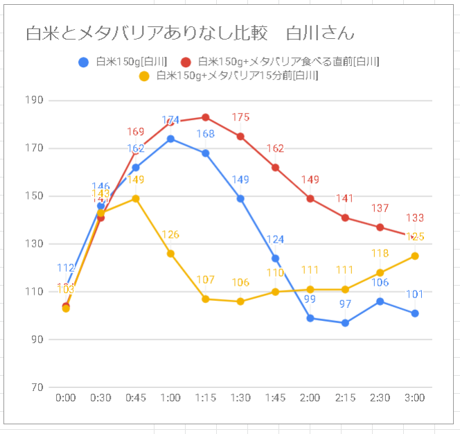 白米150gを食べる15分前に、メタバリアを4粒飲んでもらいました。