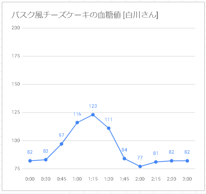 白川さんに単純にバスクチーズケーキなどを食べてもらった血糖値の結果です。